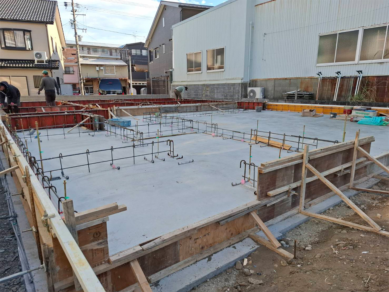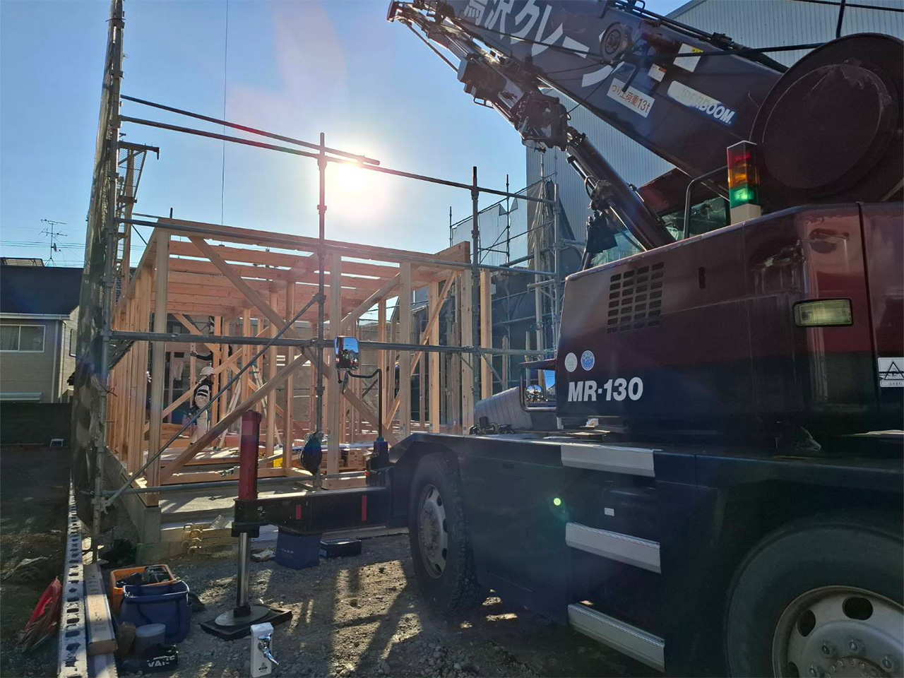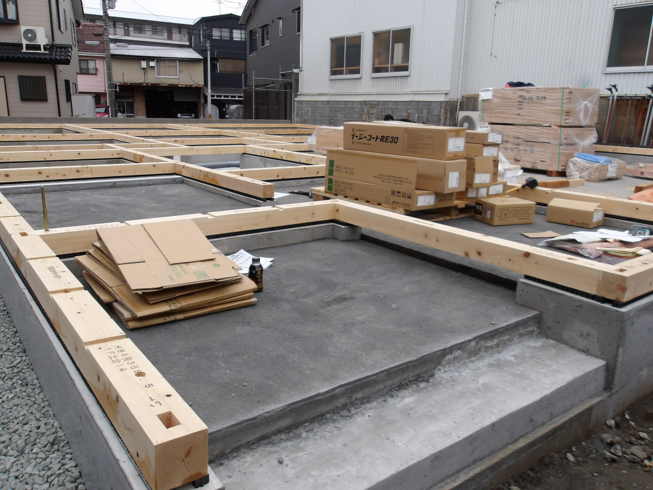 基礎の上に土台を組み、骨格づくりへと進みます。
